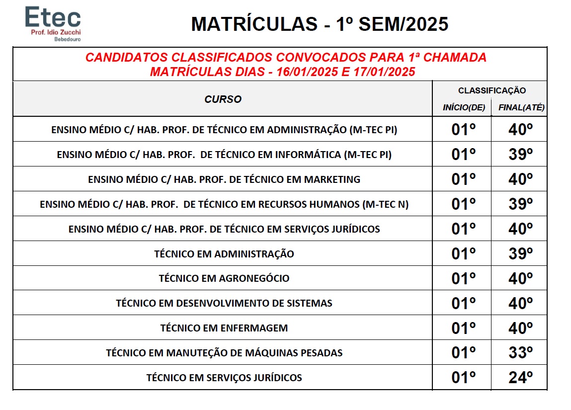 Estão disponíveis, desde o dia 13 de janeiro, no site https://www.vestibulinhoetec.com.br/, a classificação dos candidatos que realizarão as Provas do Vestibulinho das Etecs do 1º semestre 2025. Os candidatos convocados para a matrícula da 1ª chamada receberão por e-mail e SMS, cadastrados durante a inscrição, a partir do dia 15 de janeiro, após as 12h00, os avisos de com as orientações para realização da matrícula. Os documentos obrigatórios para matrícula podem ser consultados no manual do Candidato, a partir da página 31, no link https://www.vestibulinhoetec.com.br/documentos/. |