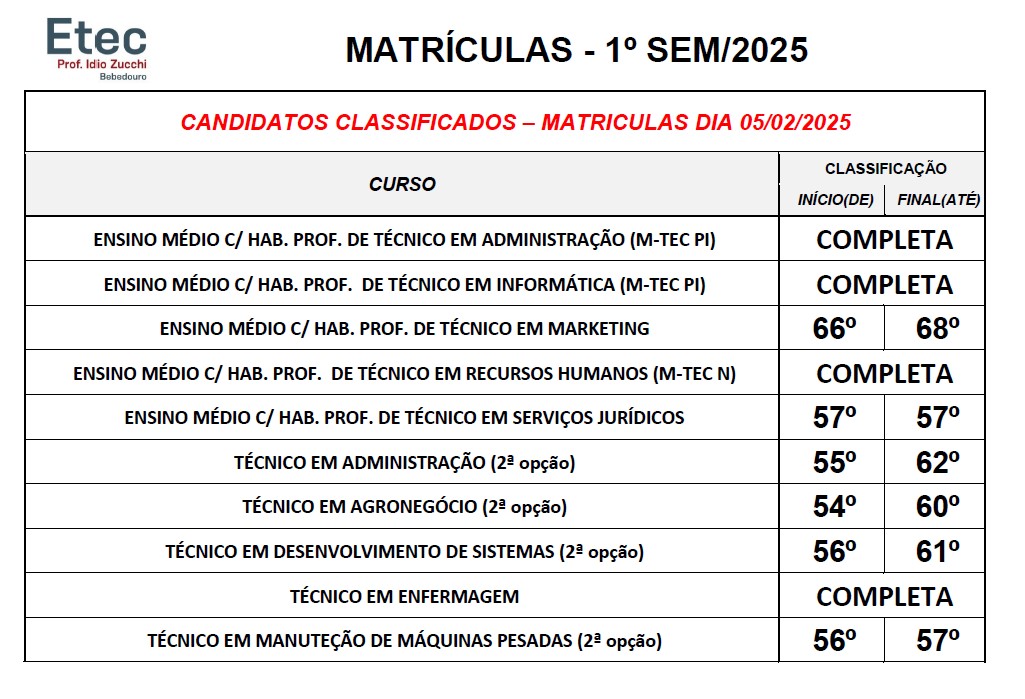 Estão disponíveis, desde o dia 13 de janeiro, no site https://www.vestibulinhoetec.com.br/, a classificação dos candidatos que realizarão as Provas do Vestibulinho das Etecs do 1º semestre 2025. Os candidatos convocados para a matrícula da 4ª chamada receberão por e-mail e SMS, cadastrados durante a inscrição, a partir do dia 04 de fevereiro, até as 18h00, os avisos de com as orientações para realização da matrícula. Os documentos obrigatórios para matrícula podem ser consultados no manual do Candidato, a partir da página 31, no link https://www.vestibulinhoetec.com.br/documentos/. |