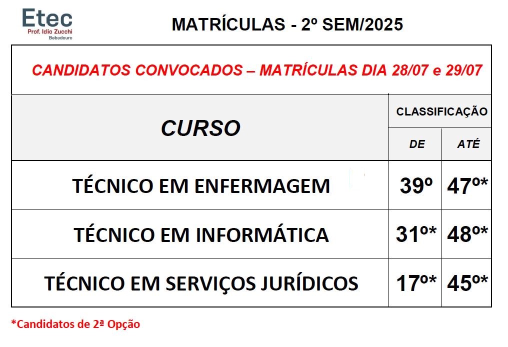 Informação - Matrículas da 2ª chamada - 2º semestre 2025