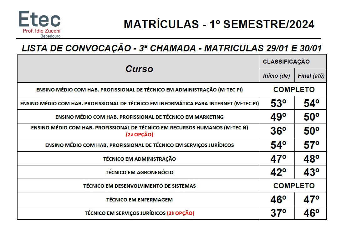 Os candidatos convocados para a matrícula da 3ª chamada receberão por e-mail e SMS, cadastrados durante a inscrição, a partir do dia 26 de janeiro, após as 12h00, os avisos de convocação para realização da matrícula.