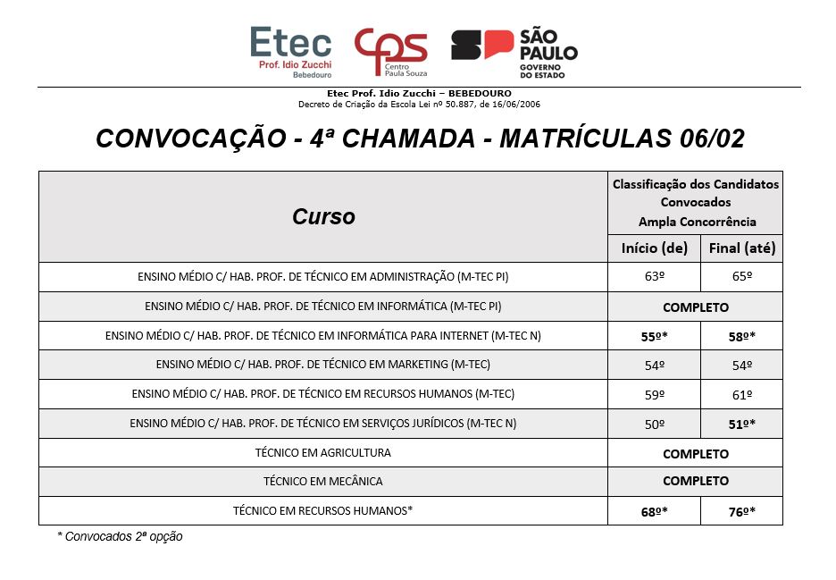 Os candidatos convocados para a matrícula da 4ª chamada receberão por e-mail e  mensagem SMS no celular, cadastrados durante a inscrição, no dia 05 de feveriero após as 14h00 os avisos de convocação para realização da matrícula.